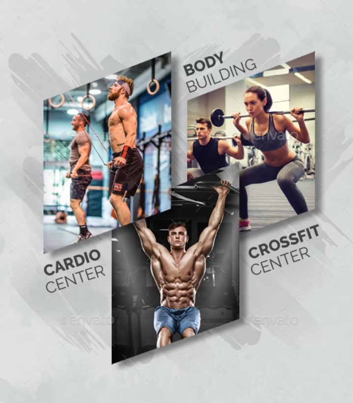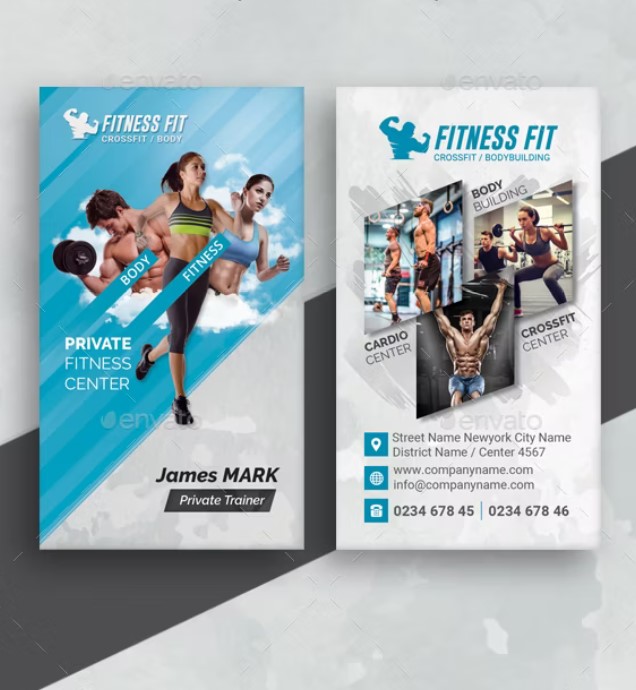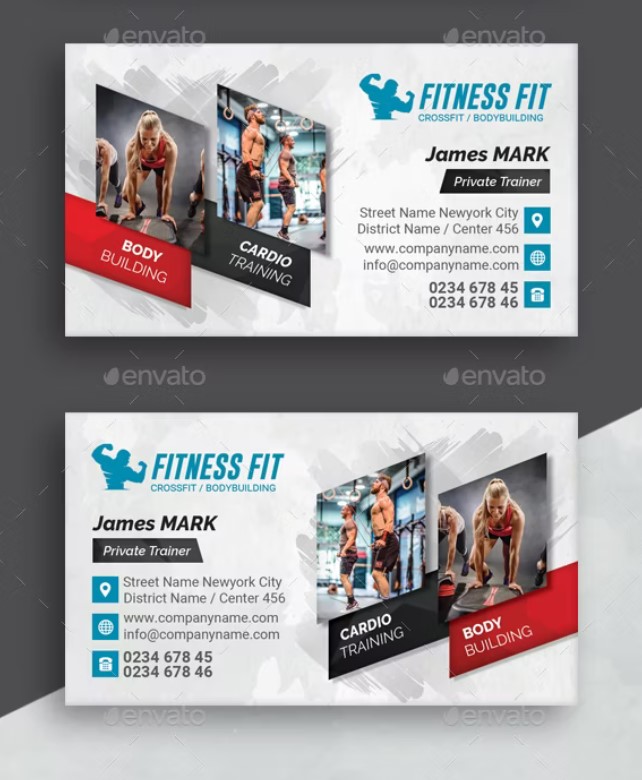Biglietto da visita per palestre, centri fitness, personal trainers. Le immagini delle persone sono di esempio e non incluse. Possono essere sostituite con le vostre o altre simili.