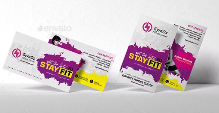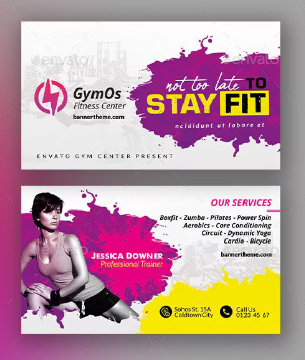 Biglietto da visita per palestre, centri fitness, personal trainers. Le immagini delle persone sono di esempio e non incluse. Possono essere sostituite con le vostre o altre simili.