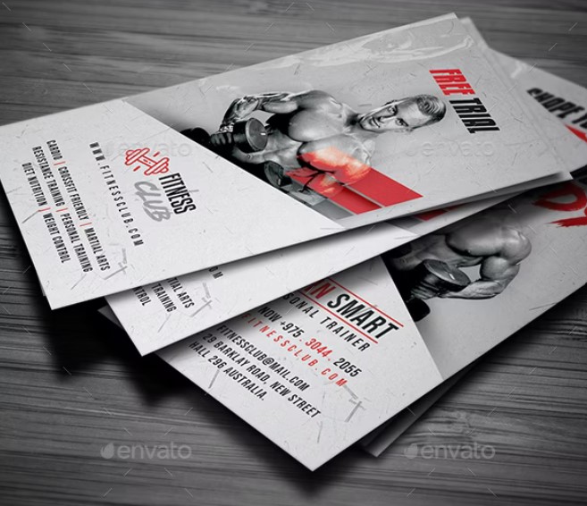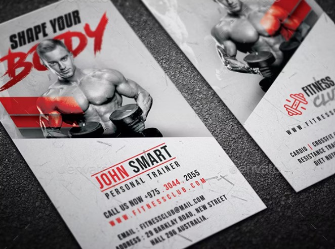 Biglietto da visita per palestre, centri fitness, personal trainers. Le immagini delle persone sono di esempio e non incluse. Possono essere sostituite con le vostre o altre simili.