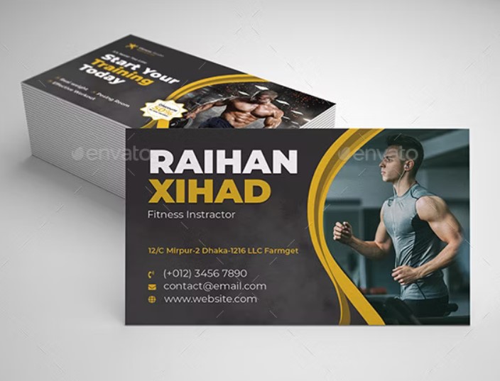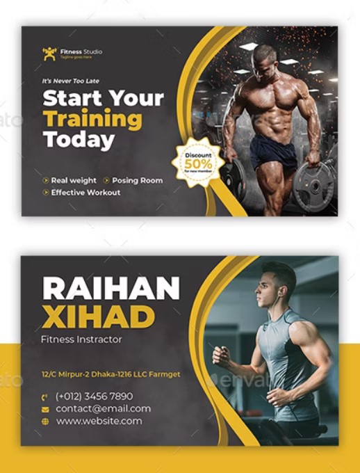 Biglietto da visita per palestre, centri fitness, personal trainers. Le immagini delle persone sono di esempio e non incluse. Possono essere sostituite con le vostre o altre simili.