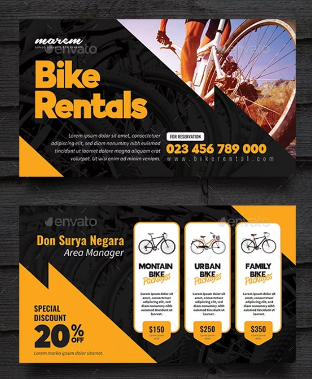 Biglietto da visita accattivante per il servizio di Noleggio Bici. Le immagini delle persone sono di esempio e non incluse. Possono essere sostituite con le vostre o altre simili.