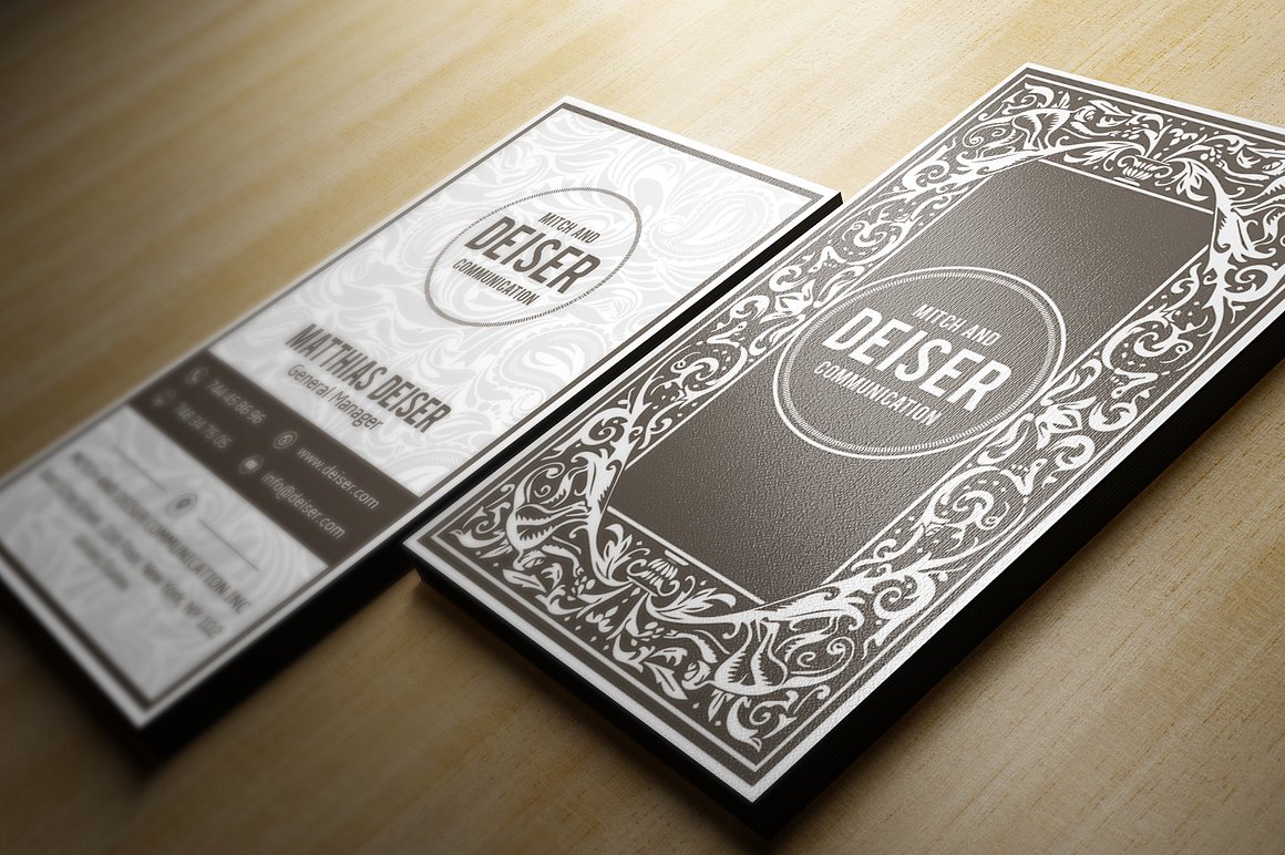 Biglietto da visita verticale classico impreziosito da decorazioni tipo floreali di sfondo.