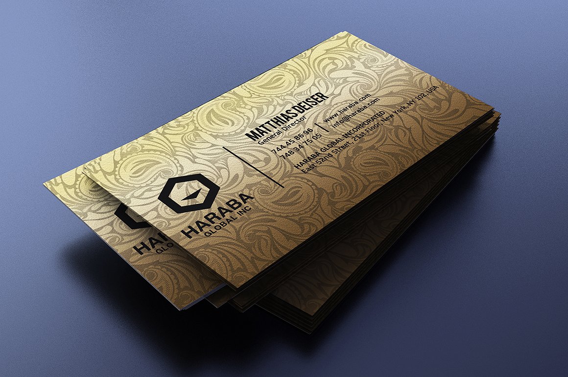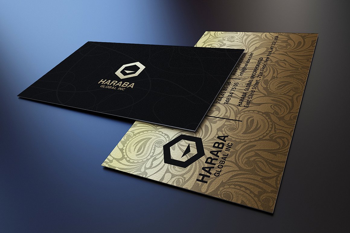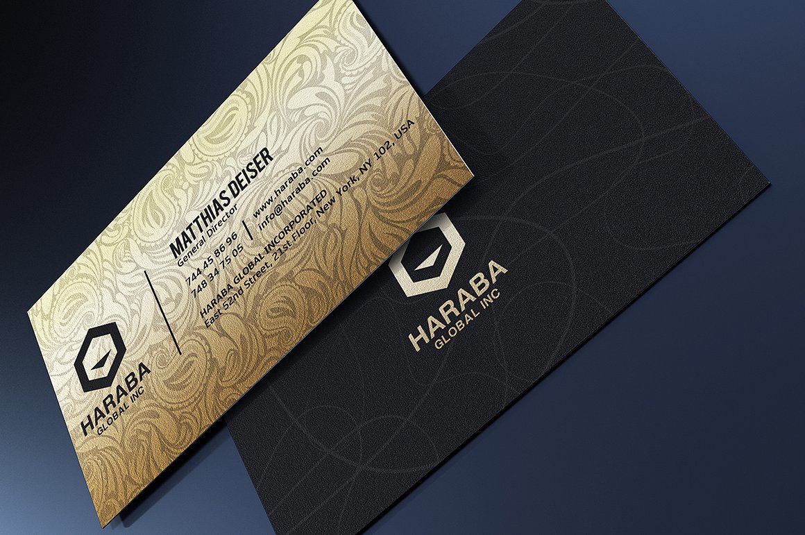 Biglietto da visita elegante, con stile minimal e caratterizzato da un lato scuro con il logo a contrasto ed un lato con effetto dorato.