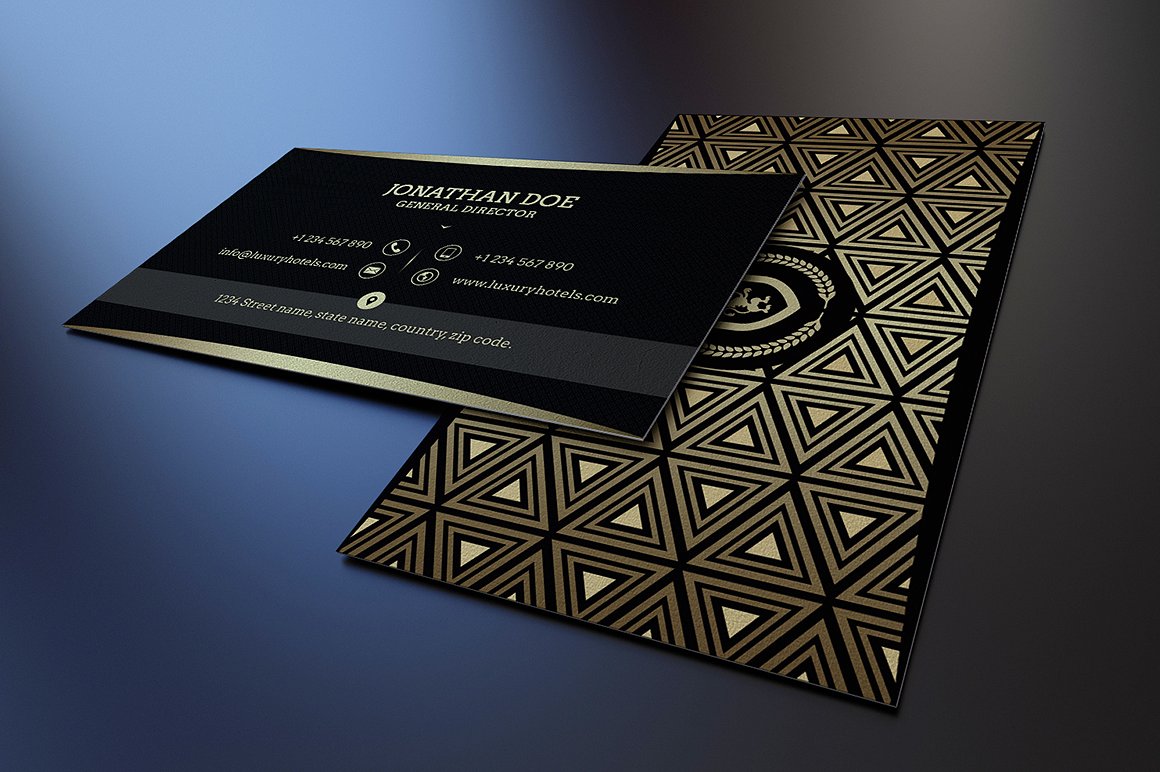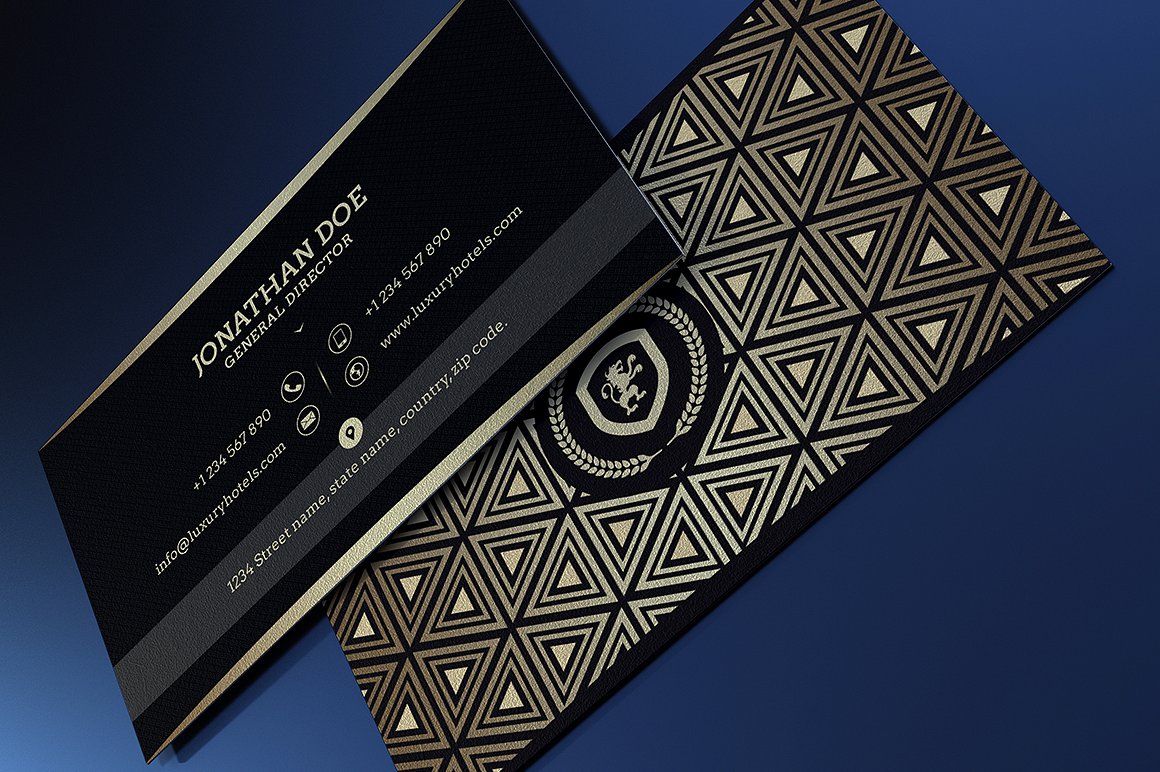 Biglietto da visita elegante, con stile raffinato e caratterizzato da un lato scuro con il logo a contrasto ed un lato impreziosito con effetto dorato. Abbinabile con qualunque colore, ideale per chi cerca qualcosa legato all’immagine del lusso.