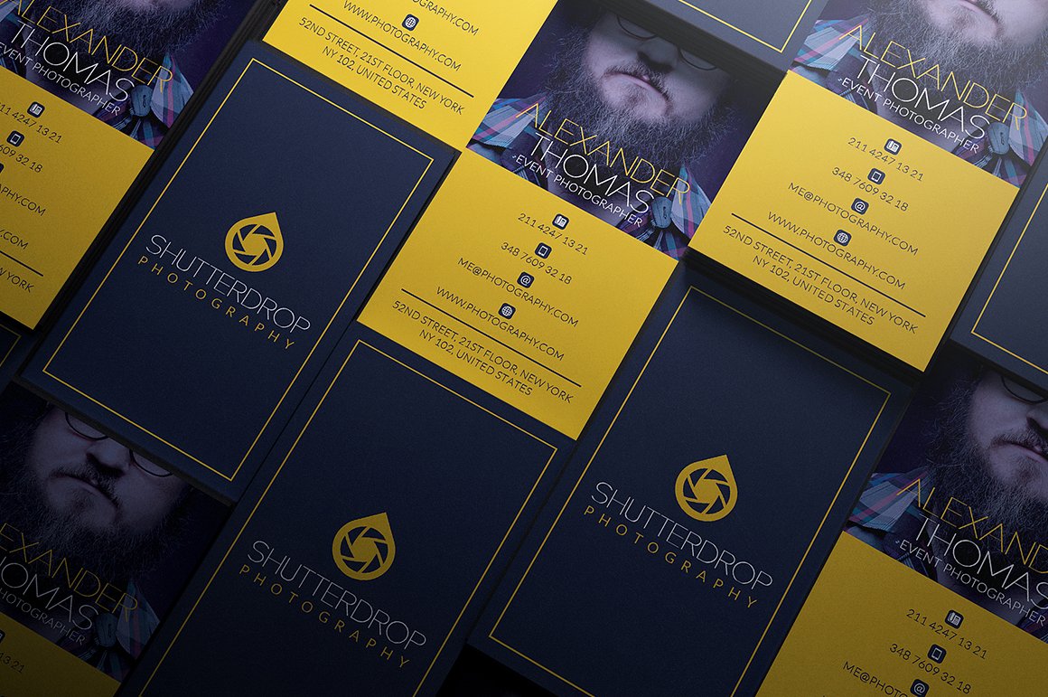 Biglietto da visita verticale pensato per i professionisti, in particolare ai fotografi caratterizzato da un lato con fondo scuro e logo ed informazioni con immagine sul secondo lato.