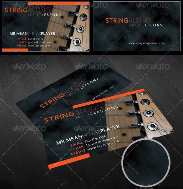 Biglietto da visita con grafica ideale per chi lavora nel mondo della musica: particolarmente indicato per chitarristi e insegnanti di chitarra.