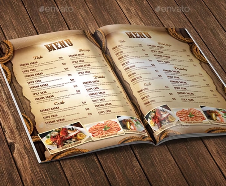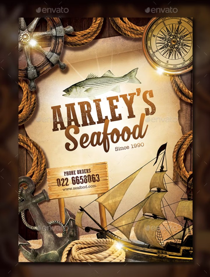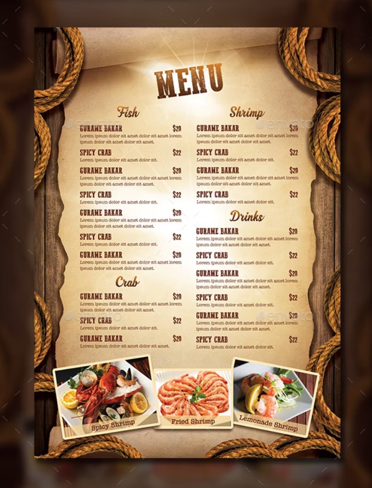 Con questo bellissimo design per il menù del tuo ristorante di pesce, hai la possibilità di distinguerti con uno stile curato e moderno e dare valore al tuo locale. Strutturato in due facciate. Possiamo personalizzare questo modello per le tue esigenze.