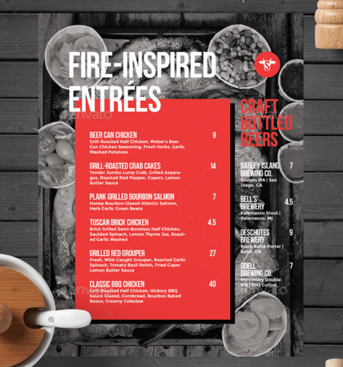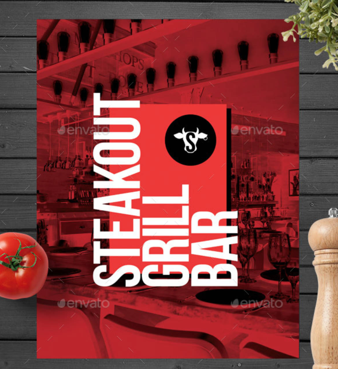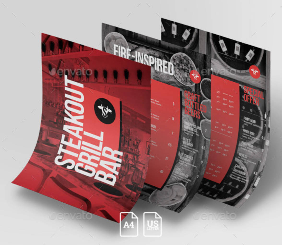 Menù modeno pub, birreria, paninoteca, e locali in genere. Doppia facciata, sul retro le preparazioni disposte in maniera ordinata e chiara. Grandi immagini di sfondo per entrambe le facciate, che possiamo personalizzare con le foto del tuo locale.