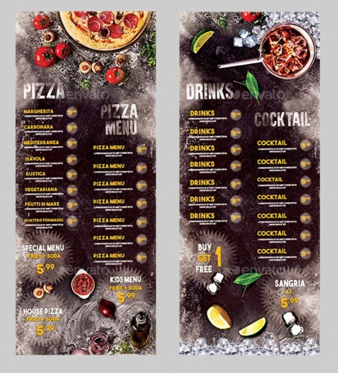 Menù moderno pub, birreria, paninoteca, locali, ristoranti o pizzerie. Doppia facciata, per dare spazio alle preparazioni in maniera ordinata e chiara. Possiamo personalizzare questo modello per le tue esigenze.