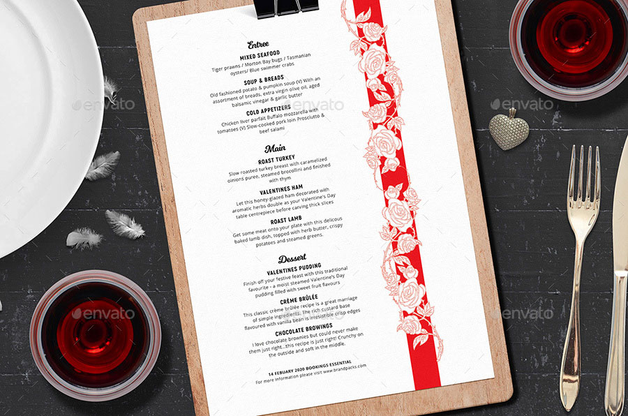 Menù per presentare al tavolo i piatti per la cena di San Valentino nel tuo locale, pub, pizzeria o ristorante. Doppia facciata rossa e bianca ma personalizzabile con i tuoi colori ed i tuoi piatti. Eleganti decorazioni floreali.