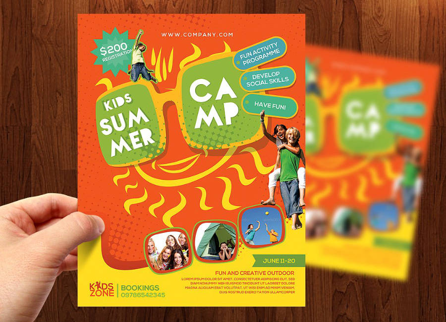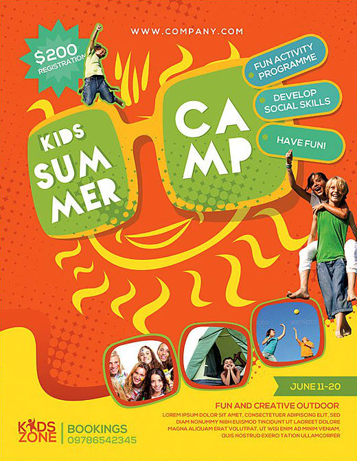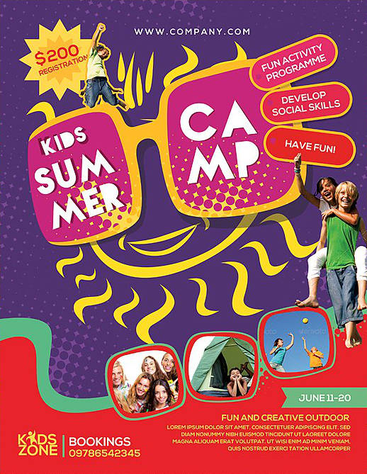 Volantino, flyer o poster con la grafica vivace e colorata, ideale per promuovere un campo estivo per ragazzi, summer camp o attività didattiche per bambini. Puoi scegliere anche solo il file senza la stampa. Perfetto per associazioni, centri sportivi che vogliono promuovere con stile il proprio evento. Personalizzabile con le tue foto.