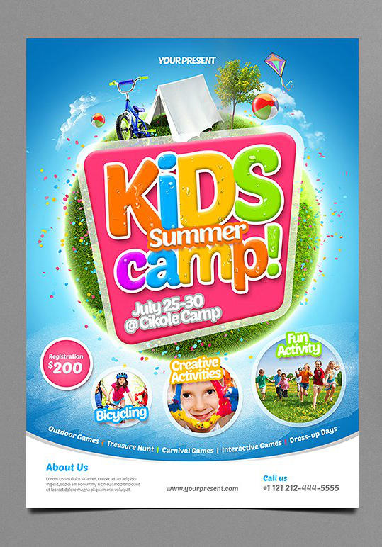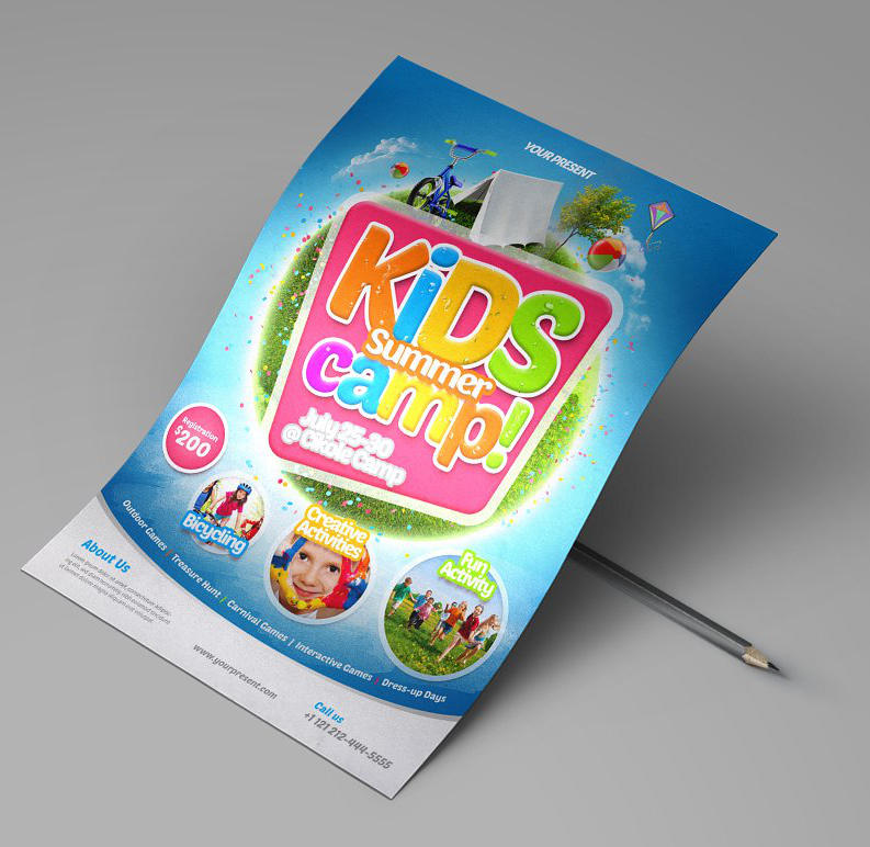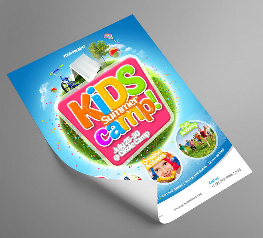 Volantino, flyer o poster con la grafica vivace e colorata, ideale per promuovere un centro estivo o altra attività legata ai bambini. Puoi scegliere anche solo il file senza la stampa. Perfetto per associazioni, centri didattici o babyparking che vogliono promuovere con stile i propri eventi. Personalizzabile con le tue foto.