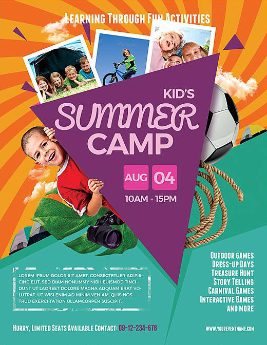 Volantino, flyer o poster con la grafica ideale per promuovere un campo estivo per ragazzi, summer camp o attività didattiche per bambini e ragazzi. Puoi scegliere anche solo il file senza la stampa. Perfetto per associazioni, centri sportivi che vogliono promuovere con stile il proprio evento. Personalizzabile con le tue foto.