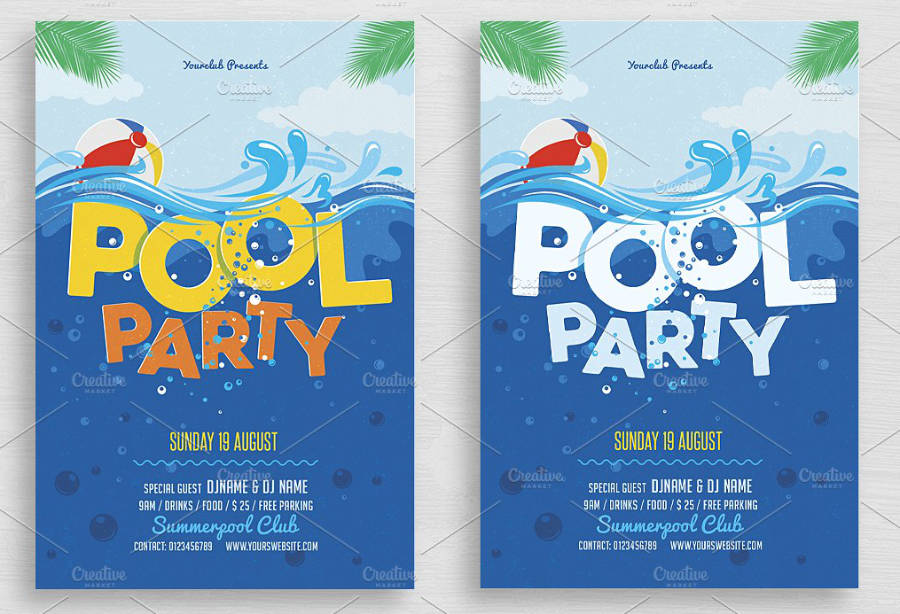 Volantino, flyer o poster con la grafica simpatica e colorata, ideale per promuovere una festa in piscina per bambini. Per centri sportivi e scuole di nuoto. Puoi scegliere anche solo il file senza la stampa.