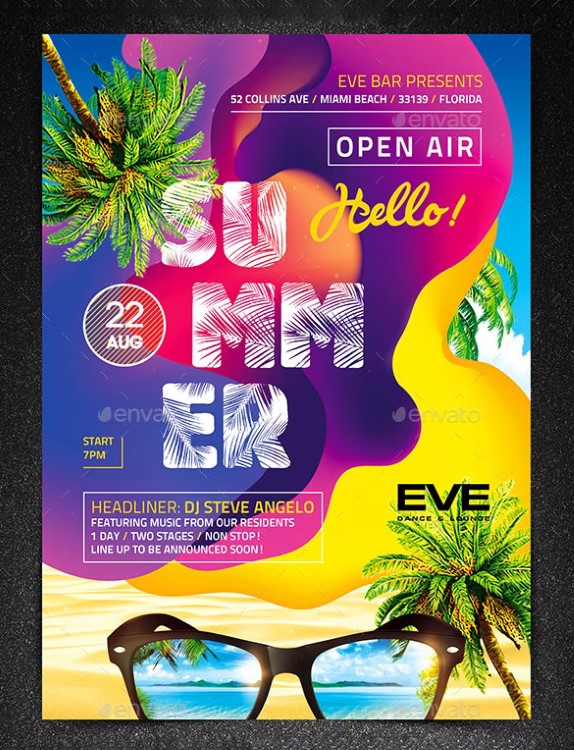 Volantino, flyer o poster con la grafica originale e colorata, ideale per promuovere un party o festa sul mare e sulla spiaggia. Puoi scegliere anche solo il file senza la stampa. Perfetto per bagni, pub e locali promuovere con stile il proprio evento. Personalizzabile.