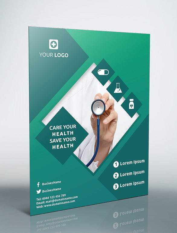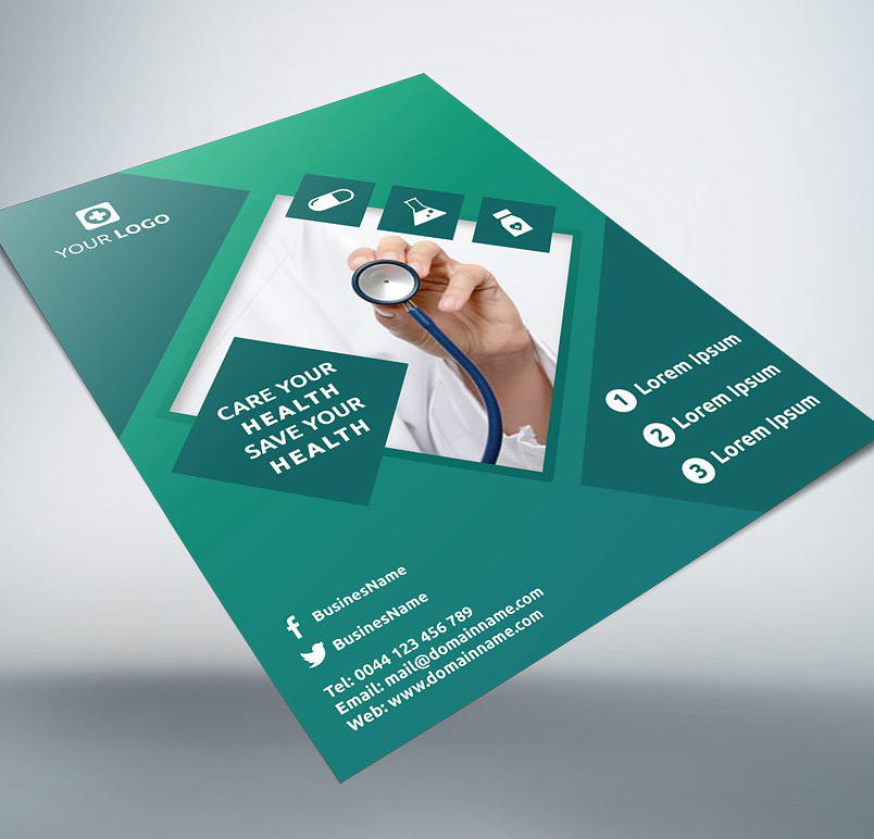 Volantino, flyer, cartolina o poster con la grafica geometrica e neutra, ideale per promuovere servizio medico, legato al mondo della sanità. Per associazioni, farmacie, ambulatori, medici. Puoi scegliere anche solo il file senza la stampa.