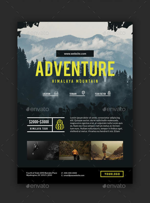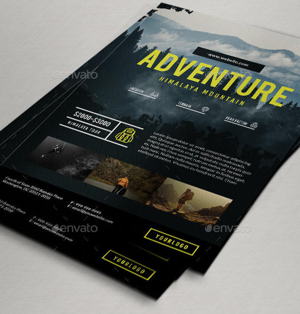 Volantino, flyer o poster perfetto per promuovere attività di escursioni o viaggi nella natura. Spazio per testo informativo ed immagini. Ideale per guide escursionistiche e tour operator.