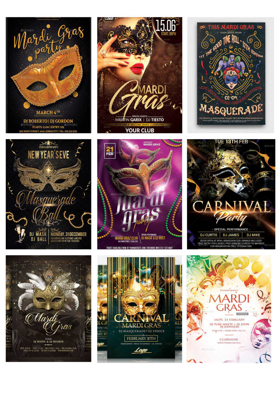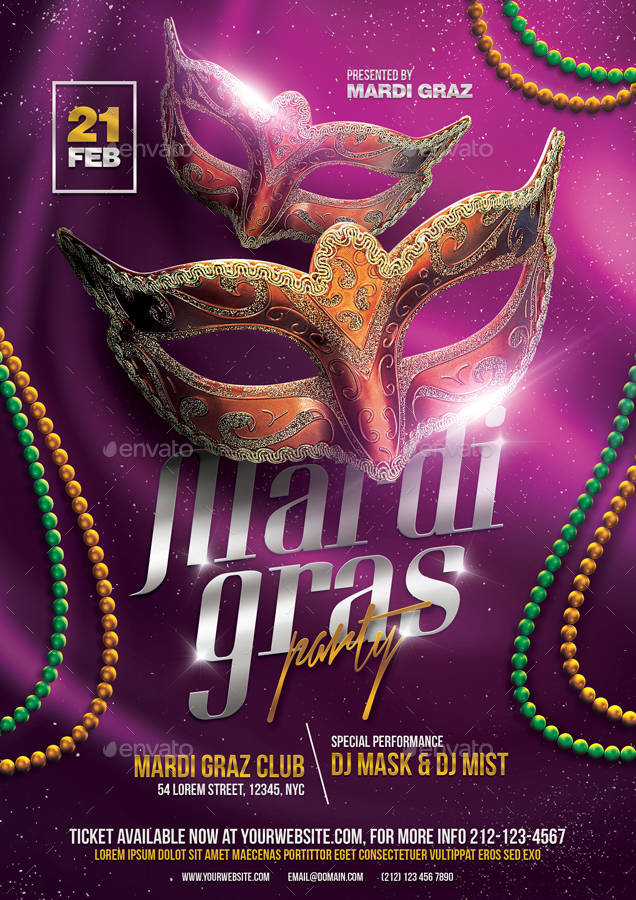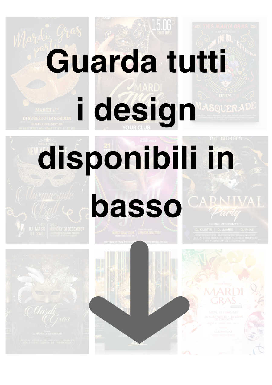 Volantino, flyer o cartolina di presentazione ideale promuovere una festa di Carnevale per il tuo locale. Grafica con maschera ricca di dettagli e spazio per le informazioni dallo stile moderno.