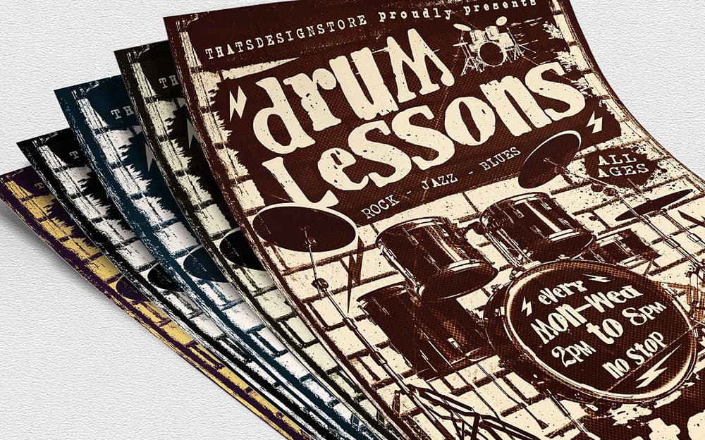 Volantino, flyer o cartolina. Ideale per scuole di musica o lezioni private di batteria. Una grafica caratteristica e molto curata, ideale per distinguerti in maniera professionale.