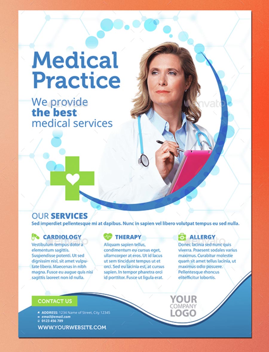 Volantino, flyer, cartolina o poster con la grafica chiara e colorata, con 6 box in evidenza più descrizione, ideale per promuovere servizio medico, legato al mondo della sanità. Per associazioni, farmacie, ambulatori, studi medici. Puoi scegliere anche solo il file senza la stampa.