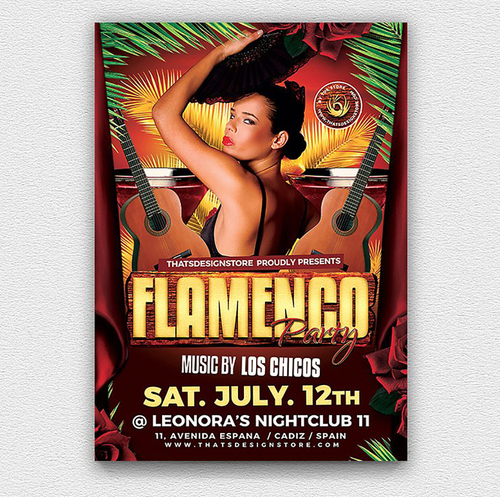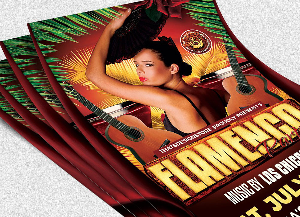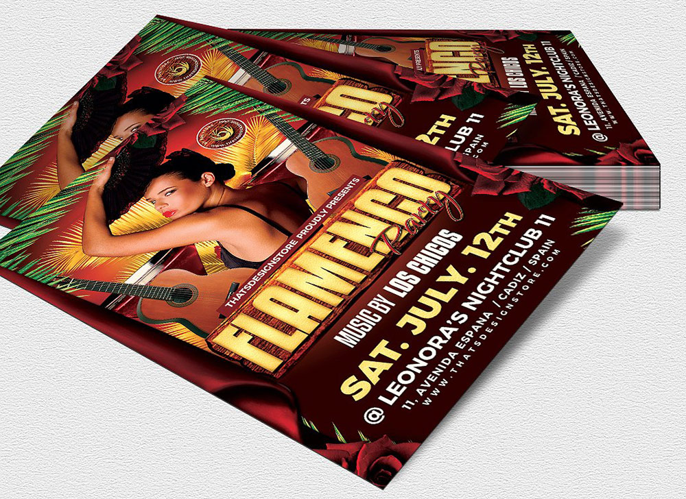 Volantino, flyer o cartolina ideale per scuole di ballo flamenco o eventi specifici dedicati alla flamenco. Una grafica caratteristica ideale per distinguerti.